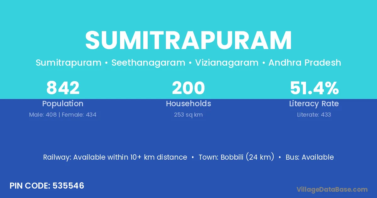 Bobbili (24 km) is the nearest town to Sumitrapuram village for major economic activities and is located approximately 24 km away.