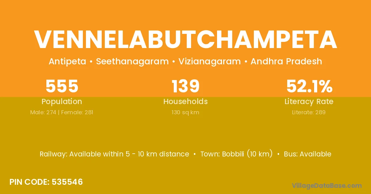 Vennelabutchampeta village has a total population of 555 people, of which 274 are males and 281 are females.