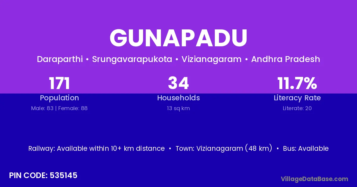 Vizianagaram (48 km) is the nearest town to Gunapadu village for major economic activities and is located approximately 48 km away.