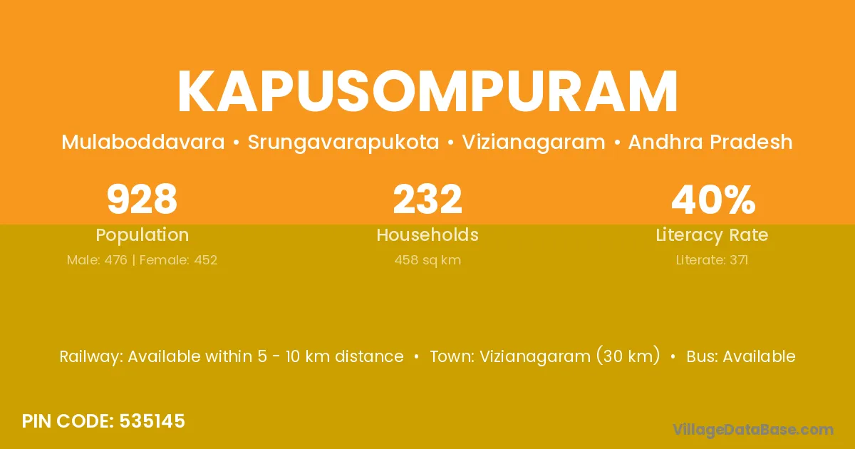 Vizianagaram (30 km) is the nearest town to Kapusompuram village for major economic activities and is located approximately 30 km away.
