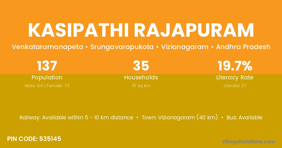 Kasipathi Rajapuram village has a total population of 137 people, of which 64 are males and 73 are females.