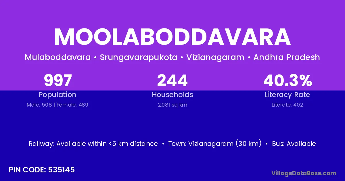 Vizianagaram (30 km) is the nearest town to Moolaboddavara village for major economic activities and is located approximately 30 km away.