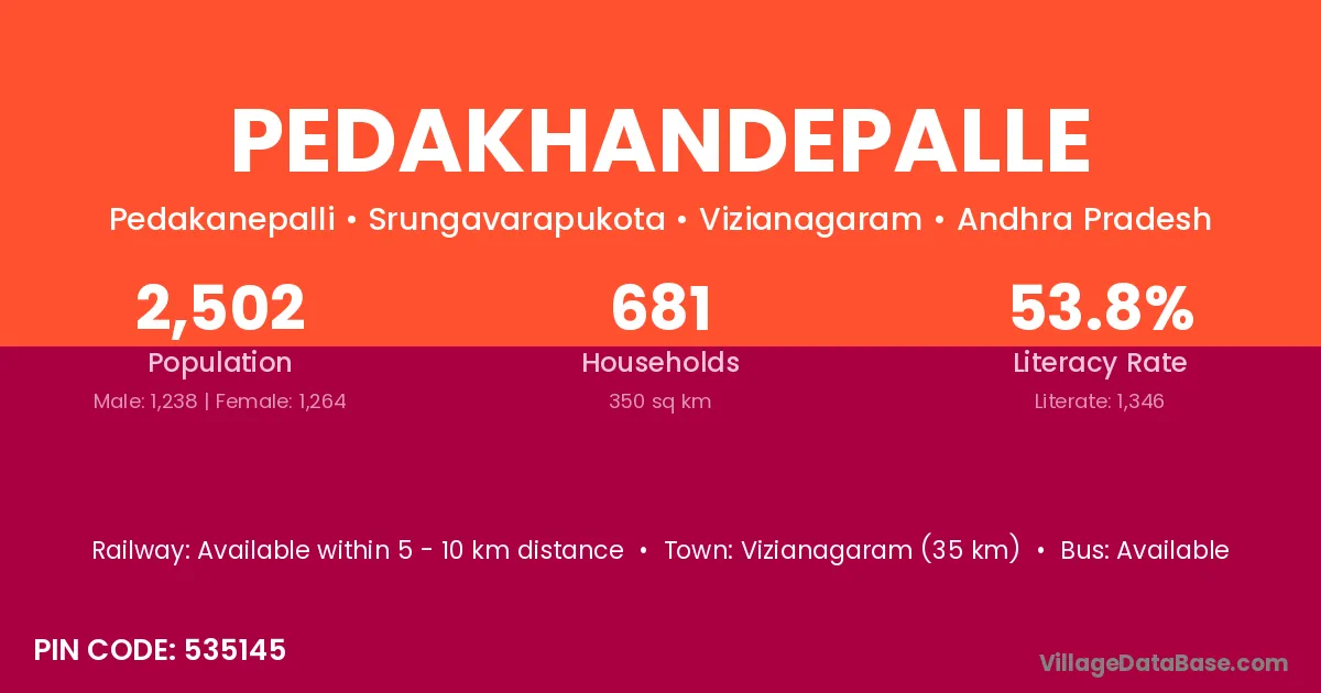 Vizianagaram (35 km) is the nearest town to Pedakhandepalle village for major economic activities and is located approximately 35 km away.
