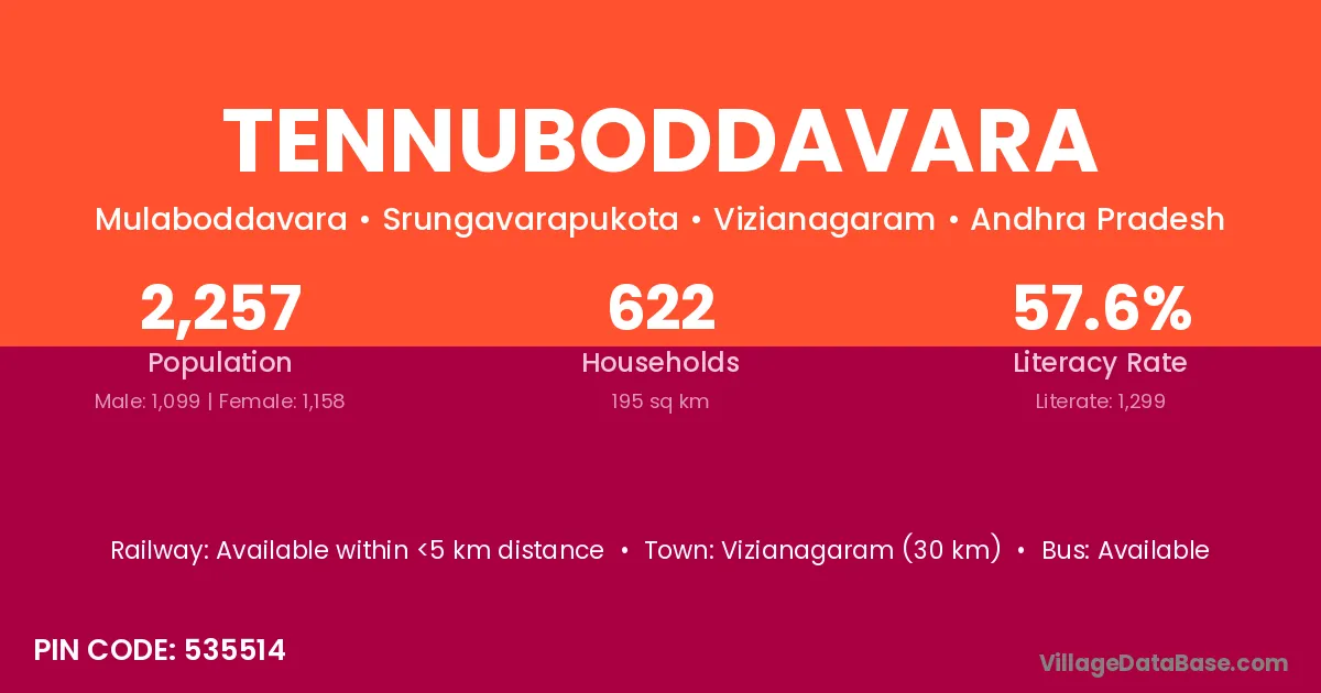 Vizianagaram (30 km) is the nearest town to Tennuboddavara village for major economic activities and is located approximately 30 km away.