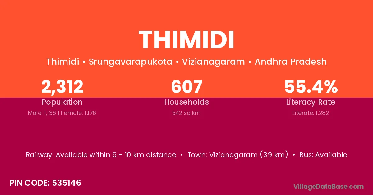 Vizianagaram (39 km) is the nearest town to Thimidi village for major economic activities and is located approximately 39 km away.