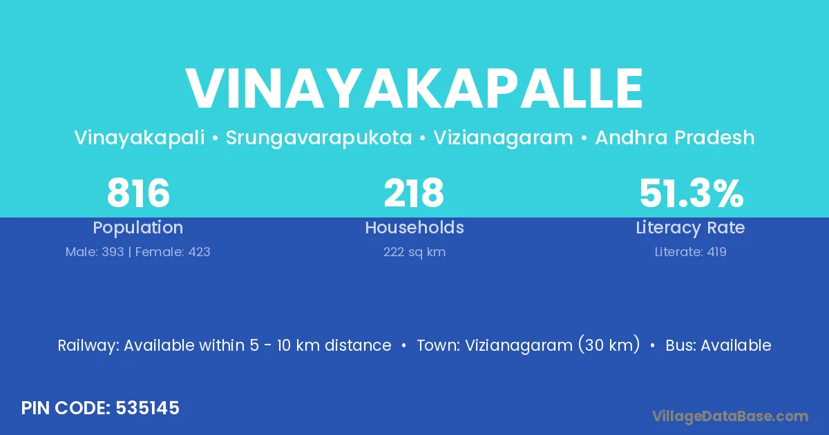 Vinayakapalle village has a total population of 816 people, of which 393 are males and 423 are females.