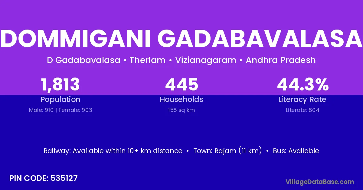 Dommigani Gadabavalasa village has a total population of 1,813 people, of which 910 are males and 903 are females.