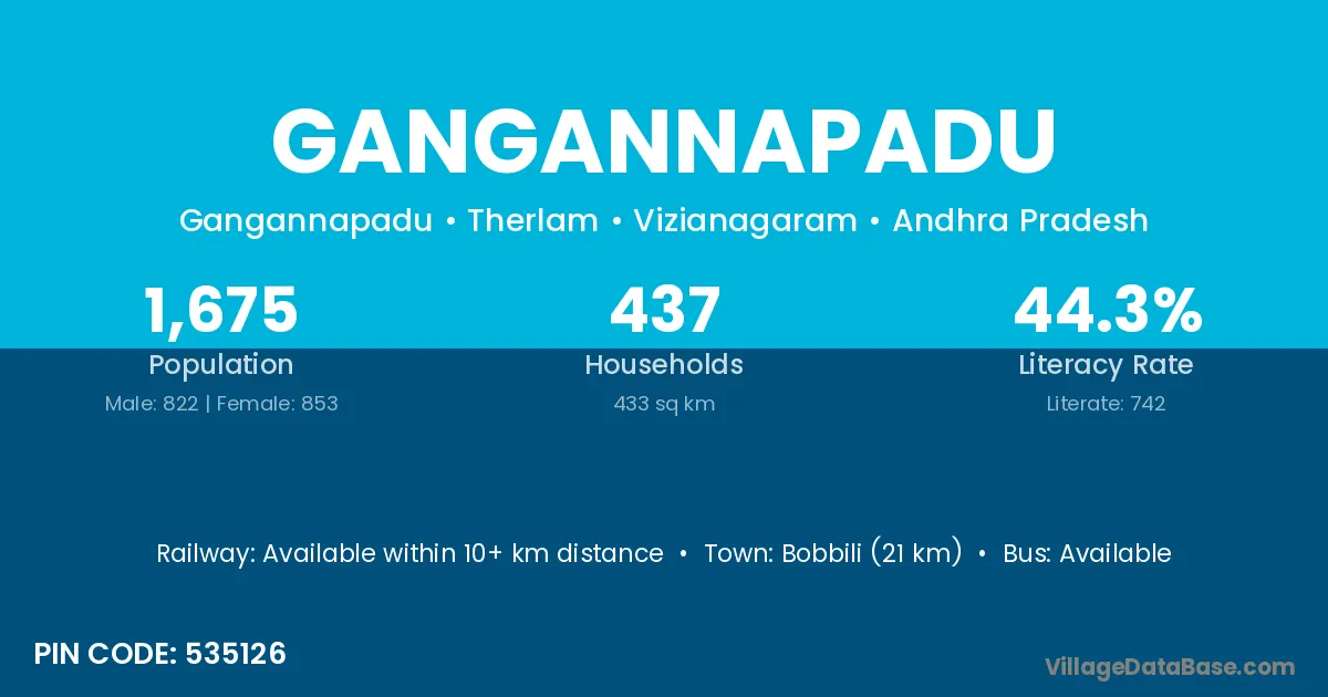 Gangannapadu village has a total population of 1,675 people, of which 822 are males and 853 are females.