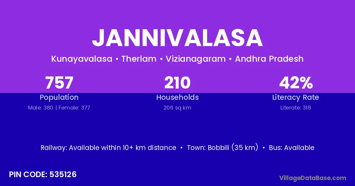 Bobbili (35 km) is the nearest town to Jannivalasa village for major economic activities and is located approximately 35 km away.