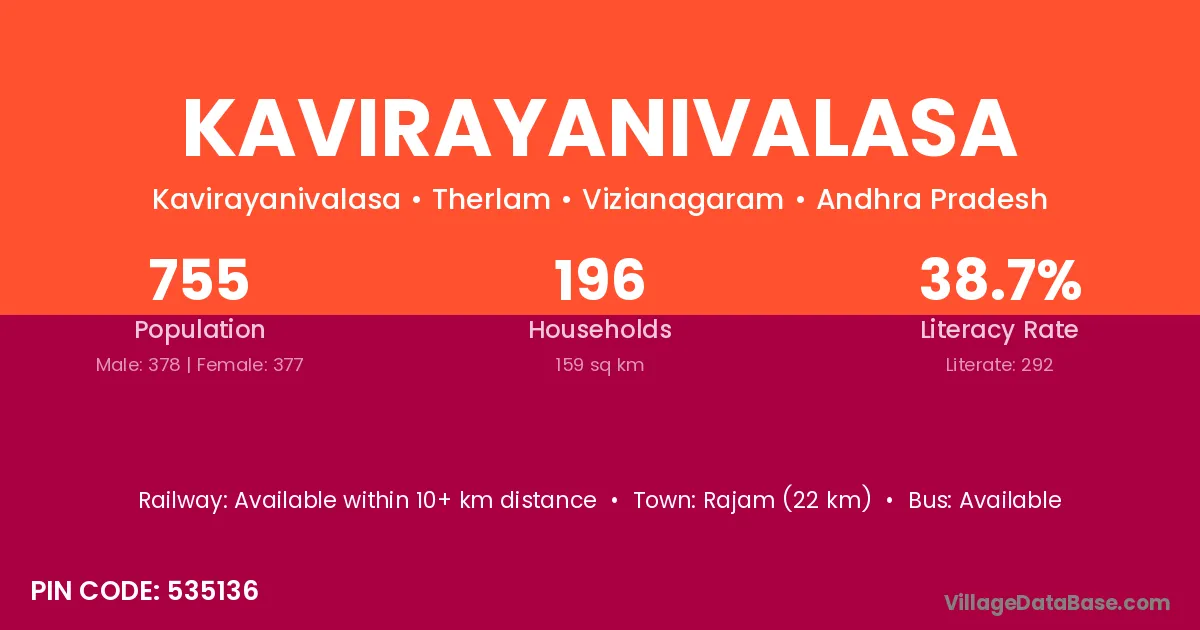 Kavirayanivalasa village has a total population of 755 people, of which 378 are males and 377 are females.