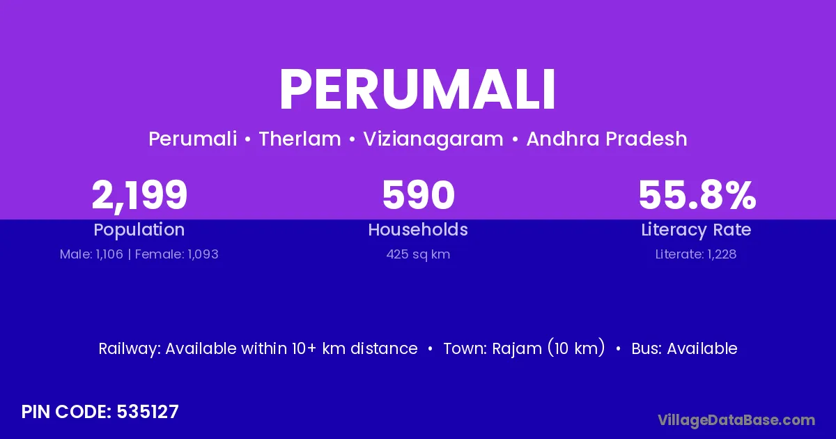 Rajam (10 km) is the nearest town to Perumali village for major economic activities and is located approximately 10 km away.
