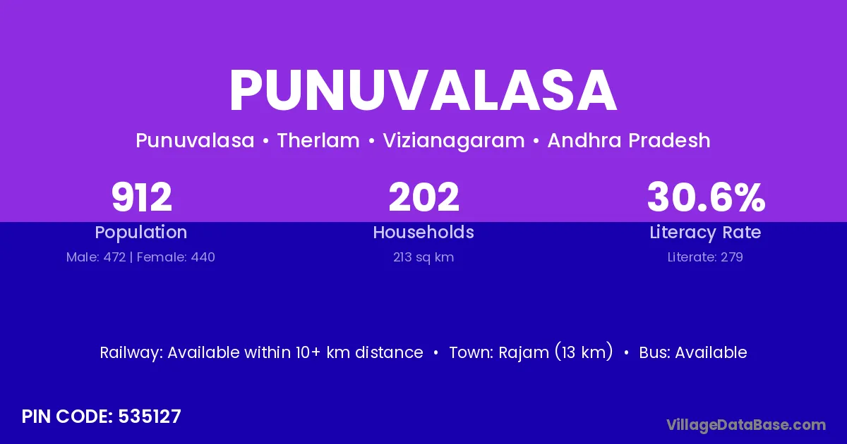 Rajam (13 km) is the nearest town to Punuvalasa village for major economic activities and is located approximately 13 km away.