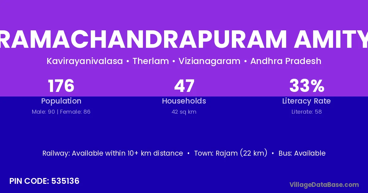 Rajam (22 km) is the nearest town to Ramachandrapuram Amity village for major economic activities and is located approximately 22 km away.