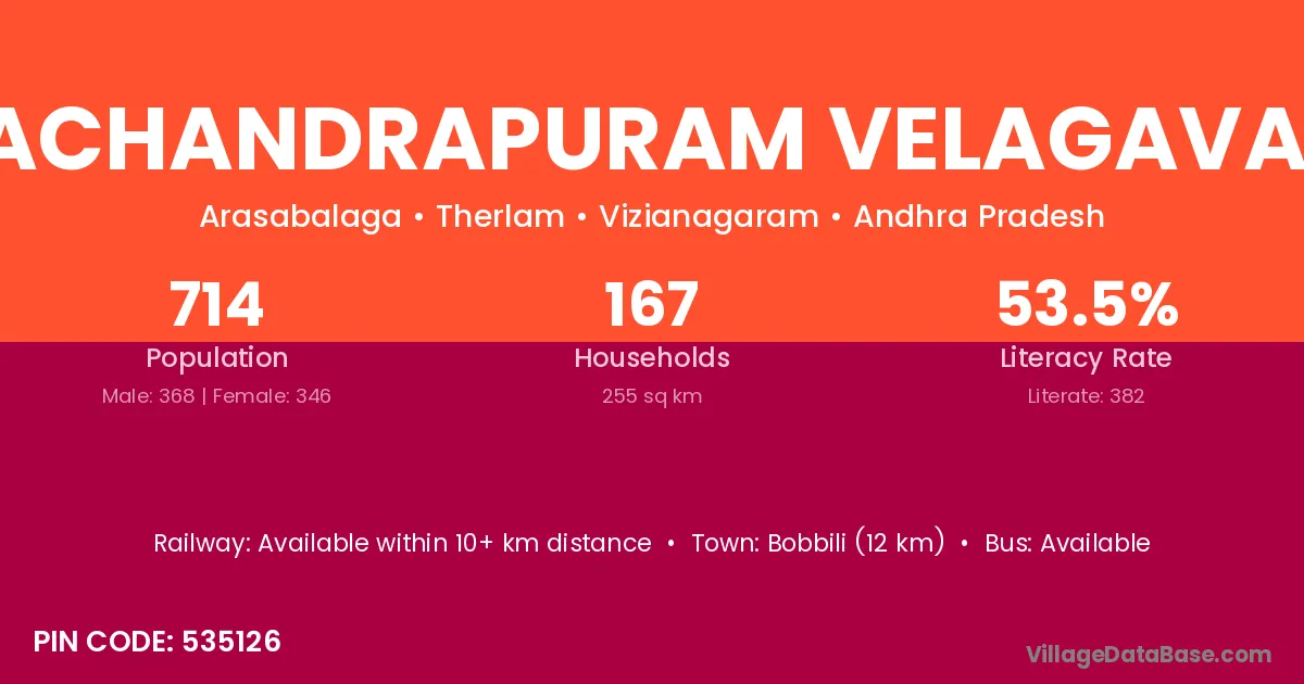 Ramachandrapuram Velagavalasa village has a total population of 714 people, of which 368 are males and 346 are females.