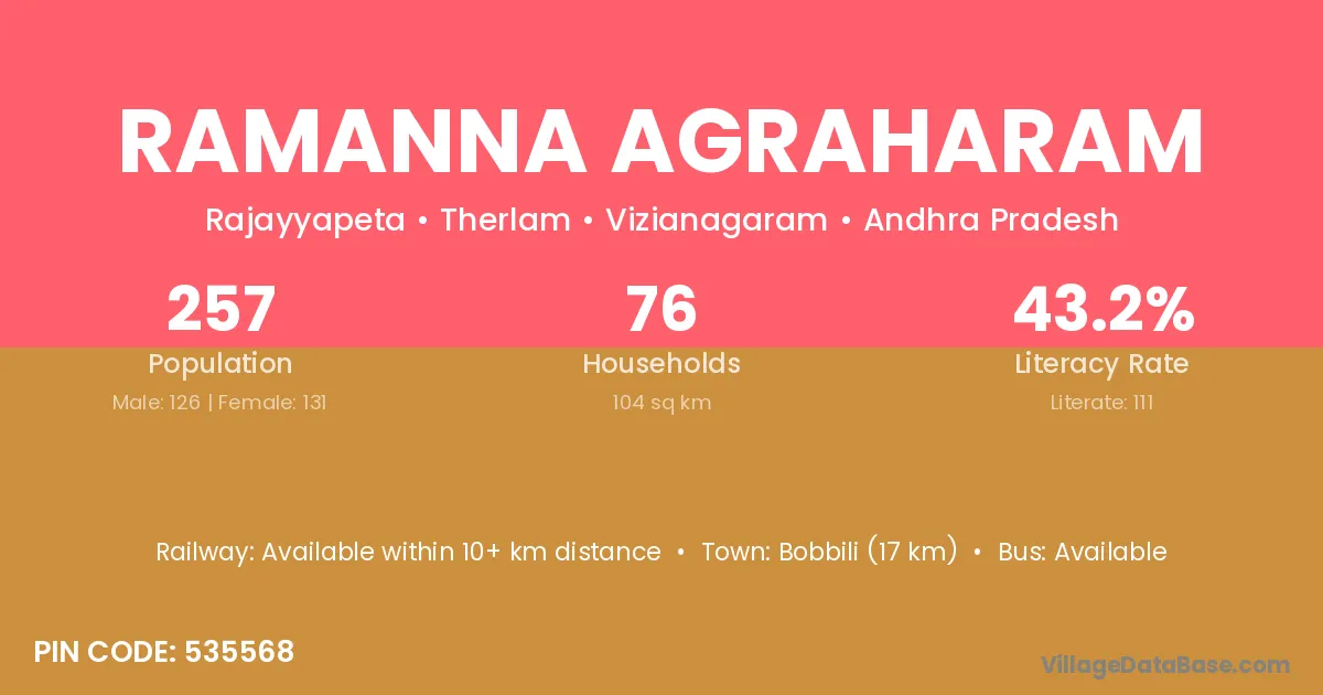 Ramanna Agraharam village has a total population of 257 people, of which 126 are males and 131 are females.