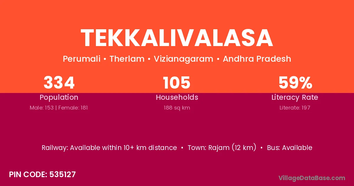 Tekkalivalasa village has a total population of 334 people, of which 153 are males and 181 are females.