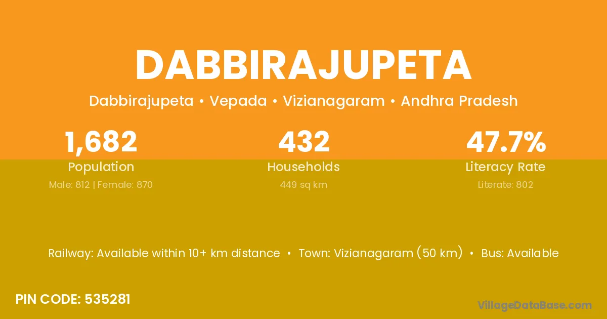 Vizianagaram (50 km) is the nearest town to Dabbirajupeta village for major economic activities and is located approximately 50 km away.