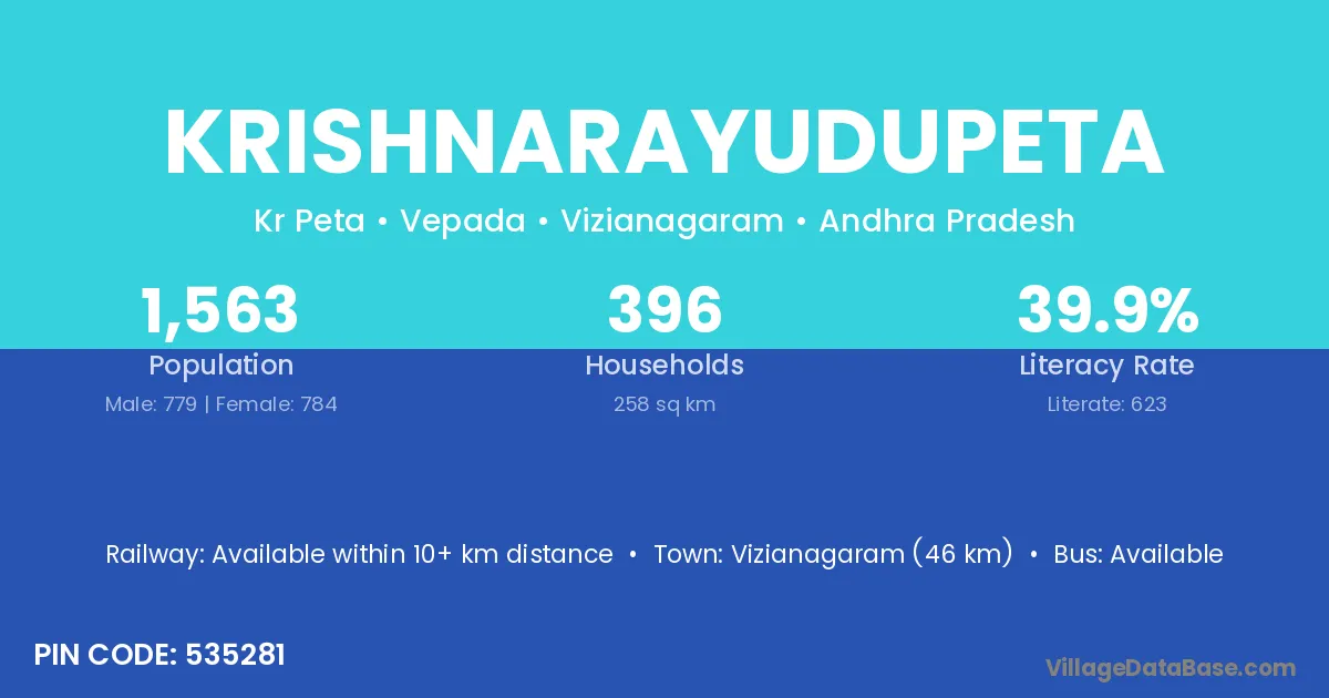Krishnarayudupeta village has a total population of 1,563 people, of which 779 are males and 784 are females.