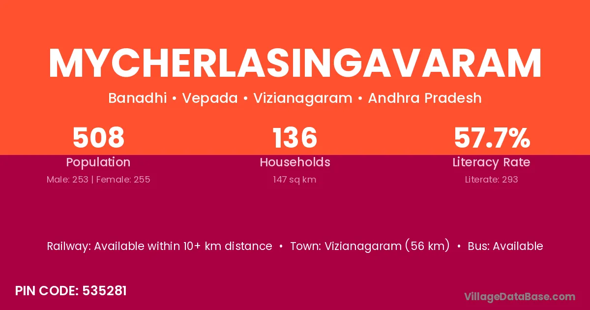 Mycherlasingavaram village has a total population of 508 people, of which 253 are males and 255 are females.