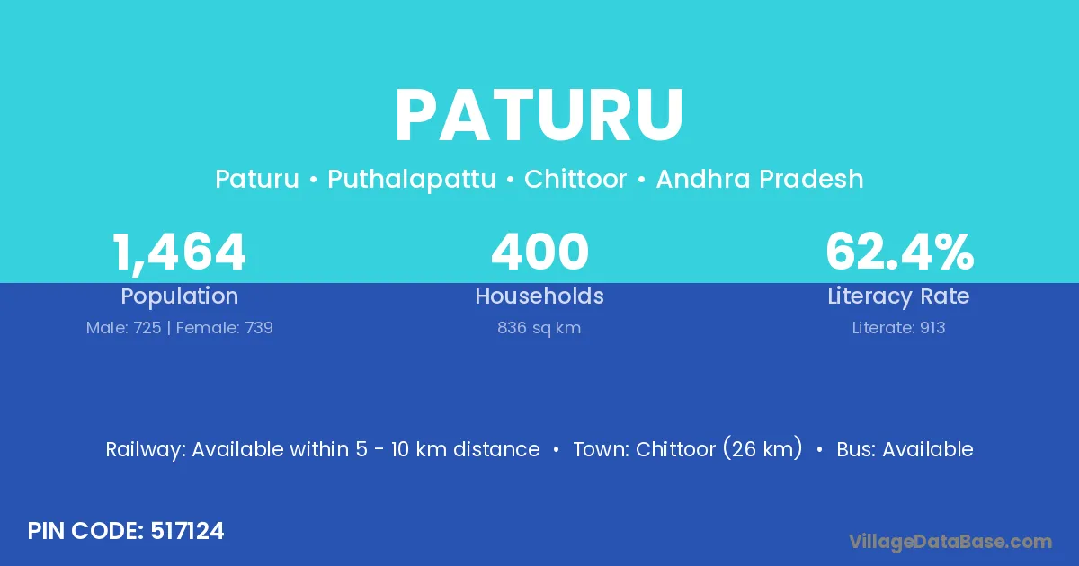 Vizianagaram (43 km) is the nearest town to Paturu village for major economic activities and is located approximately 43 km away.