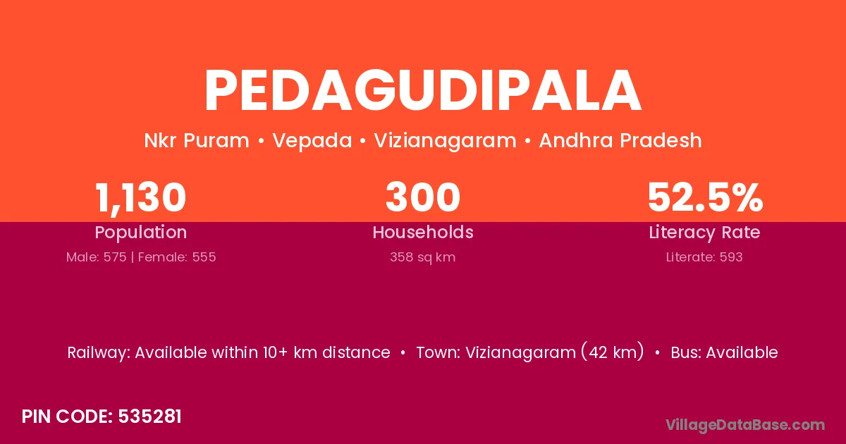 Pedagudipala village has a total population of 1,130 people, of which 575 are males and 555 are females.