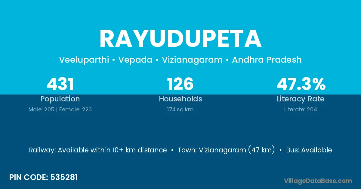 Rayudupeta village has a total population of 431 people, of which 205 are males and 226 are females.
