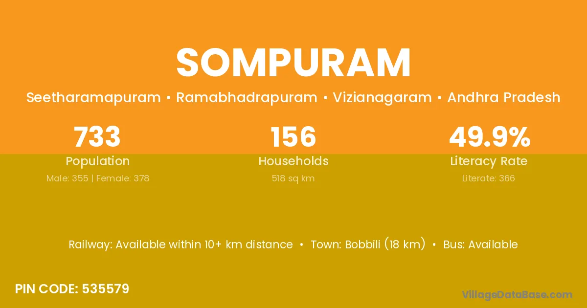 Vizianagaram (40 km) is the nearest town to Sompuram village for major economic activities and is located approximately 40 km away.