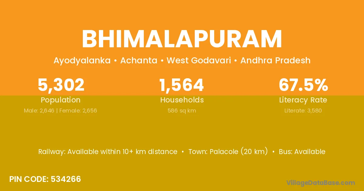 Palacole (20 km) is the nearest town to Bhimalapuram village for major economic activities and is located approximately 20 km away.