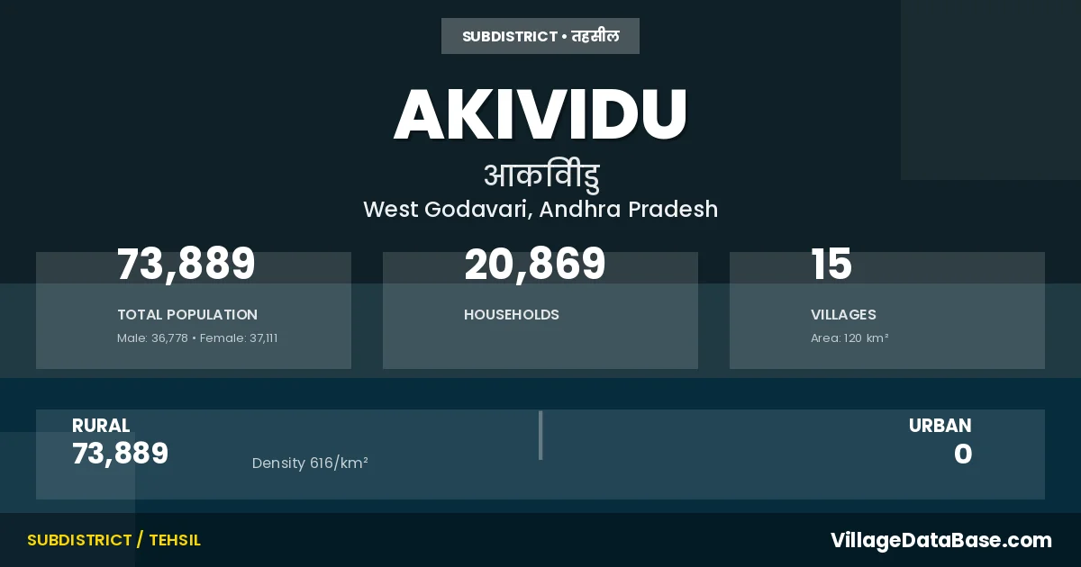 According to the 2011 census The total area of Akividu Mandal is 120 km², with a population of 73889 people. The population density is 616 inhabitants per square kilometre, and there are approximately 20869 houses in the sub district.