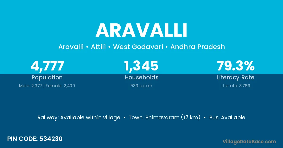 Bhimavaram (17 km) is the nearest town to Aravalli village for major economic activities and is located approximately 17 km away.