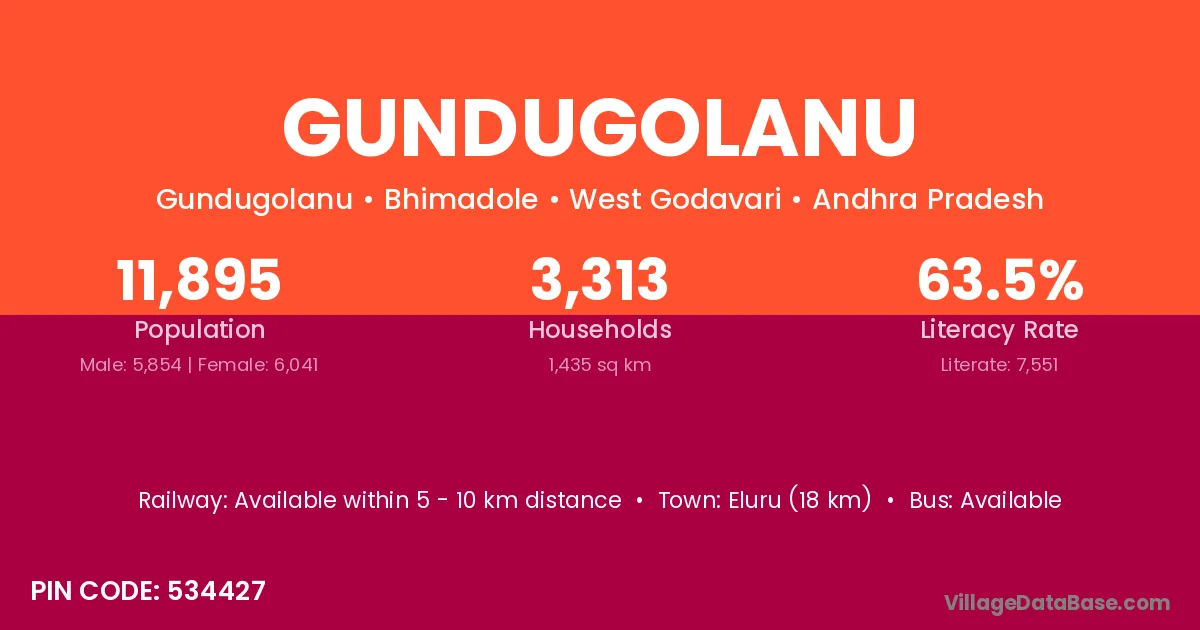 Gundugolanu village has a total population of 11,895 people, of which 5,854 are males and 6,041 are females.