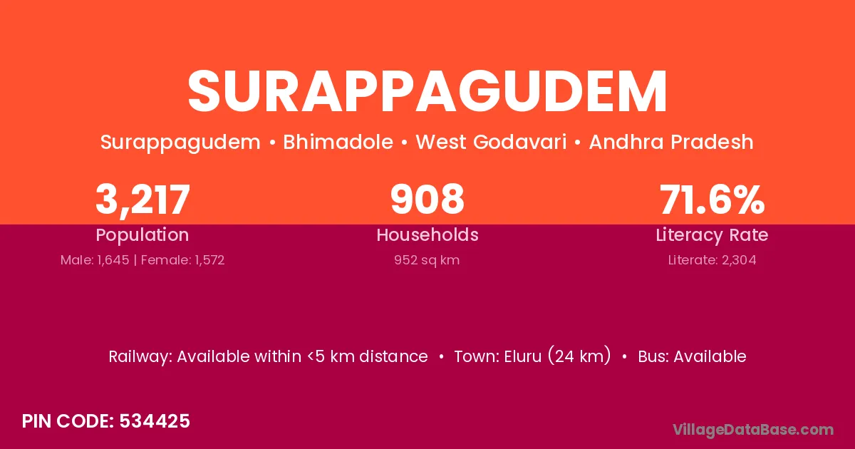 Surappagudem village has a total population of 3,217 people, of which 1,645 are males and 1,572 are females.