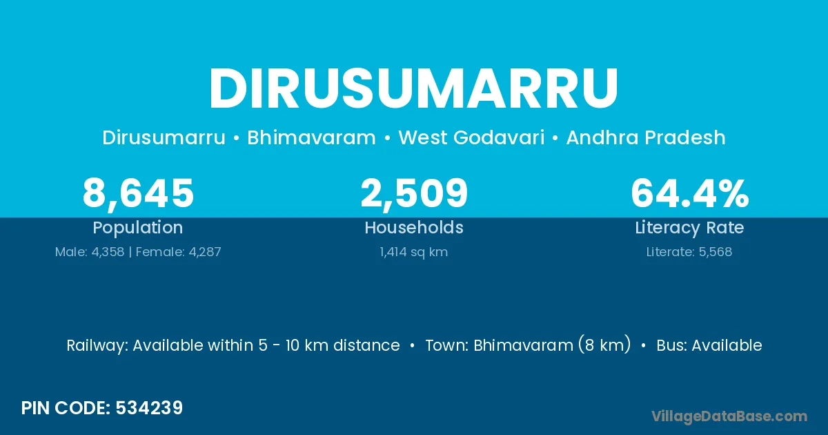 Bhimavaram (8 km) is the nearest town to Dirusumarru village for major economic activities and is located approximately 8 km away.