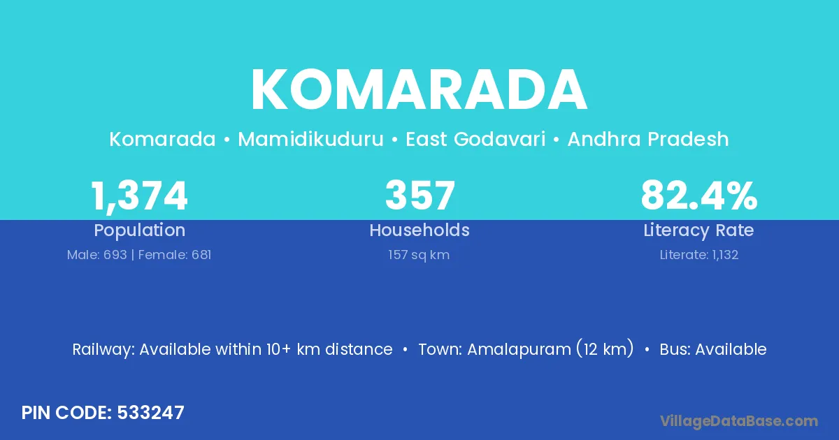 Bhimavaram (4 km) is the nearest town to Komarada village for major economic activities and is located approximately 4 km away.