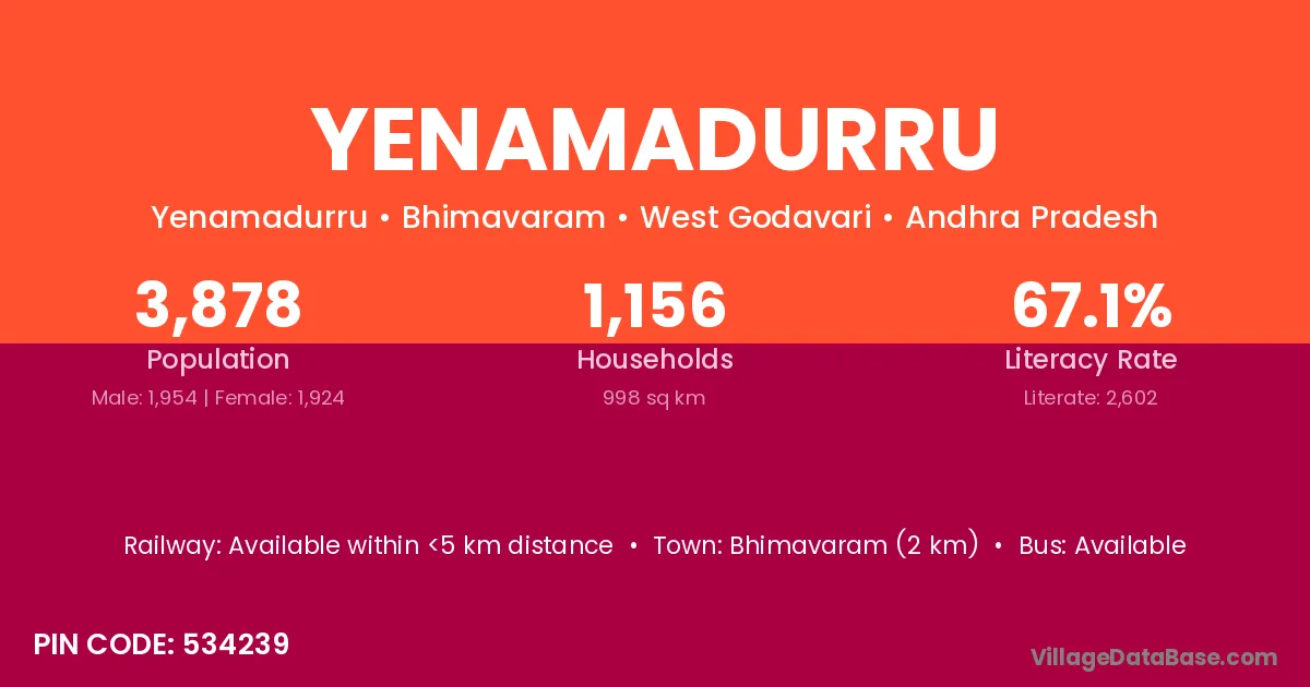 Bhimavaram (2 km) is the nearest town to Yenamadurru village for major economic activities and is located approximately 2 km away.