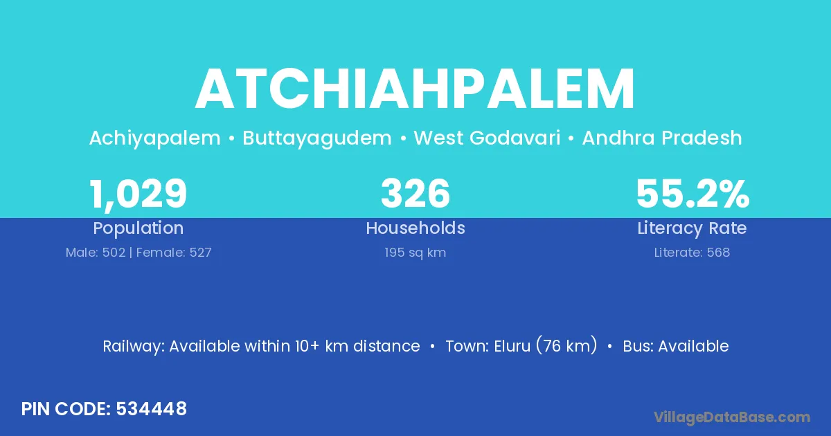 Eluru (76 km) is the nearest town to Atchiahpalem village for major economic activities and is located approximately 76 km away.