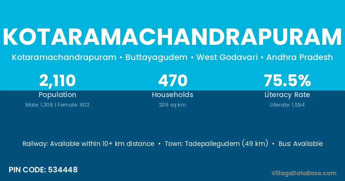 Tadepallegudem (49 km) is the nearest town to Kotaramachandrapuram village for major economic activities and is located approximately 49 km away.