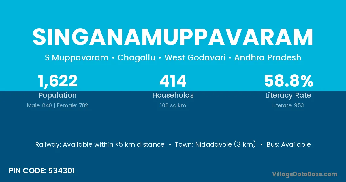 Nidadavole (3 km) is the nearest town to Singanamuppavaram village for major economic activities and is located approximately 3 km away.