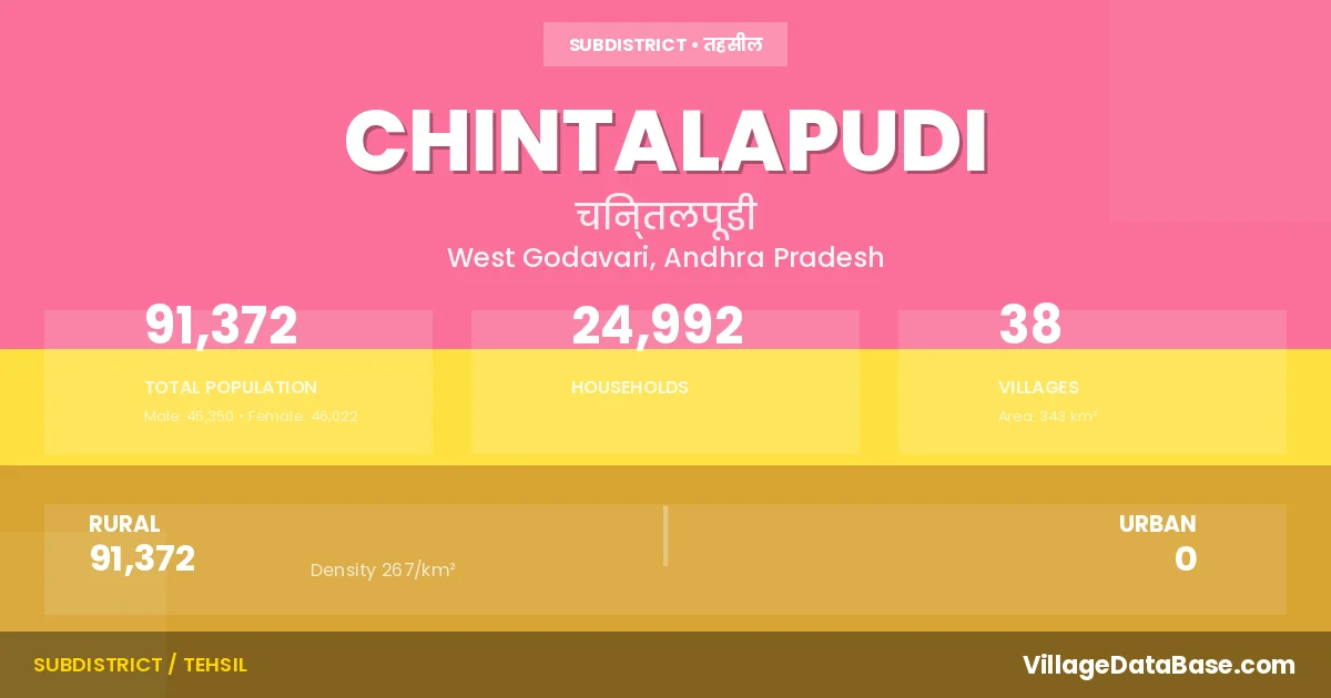 According to the 2011 census The total area of Chintalapudi Mandal is 343 km², with a population of 91372 people. The population density is 267 inhabitants per square kilometre, and there are approximately 24992 houses in the sub district.