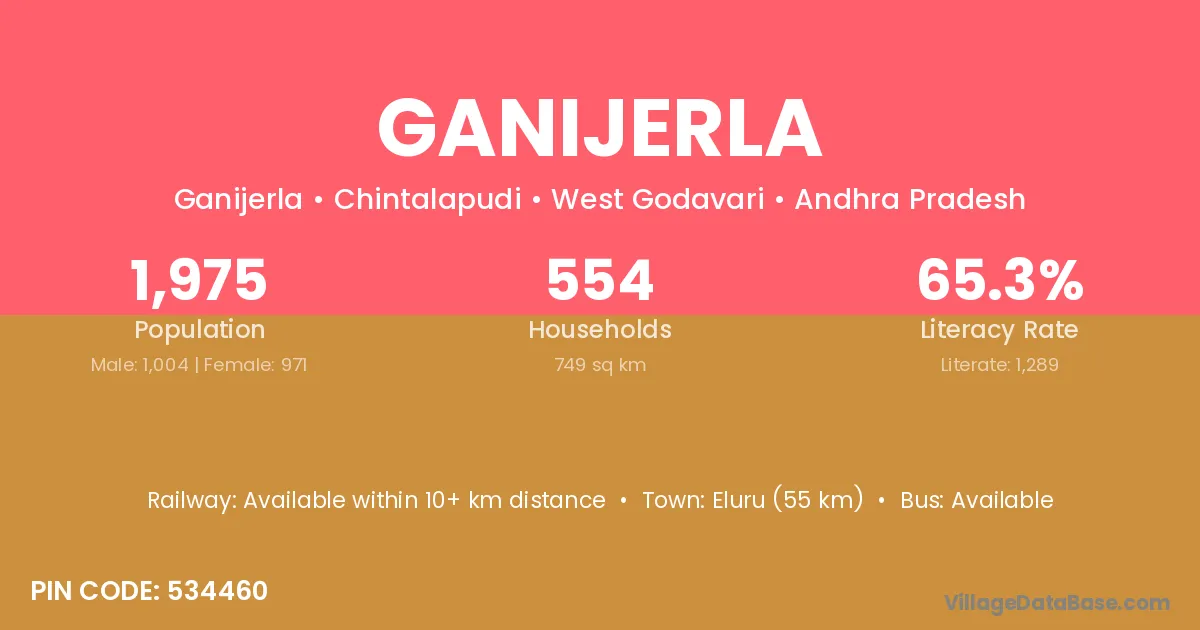 Eluru (55 km) is the nearest town to Ganijerla village for major economic activities and is located approximately 55 km away.