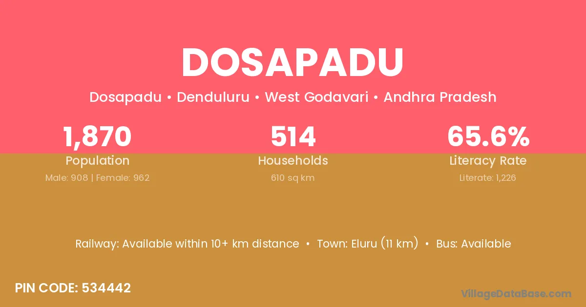 Eluru (11 km) is the nearest town to Dosapadu village for major economic activities and is located approximately 11 km away.