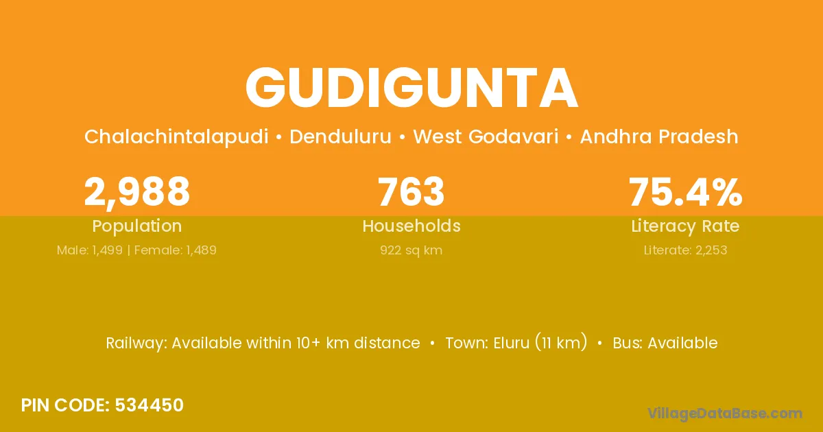 Eluru (11 km) is the nearest town to Gudigunta village for major economic activities and is located approximately 11 km away.