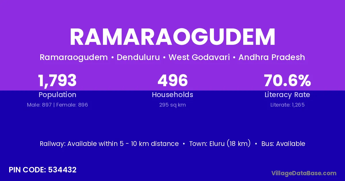 Ramaraogudem village has a total population of 1,793 people, of which 897 are males and 896 are females.