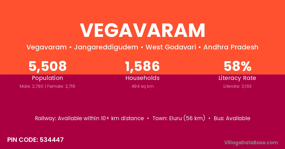 Eluru (8 km) is the nearest town to Vegavaram village for major economic activities and is located approximately 8 km away.