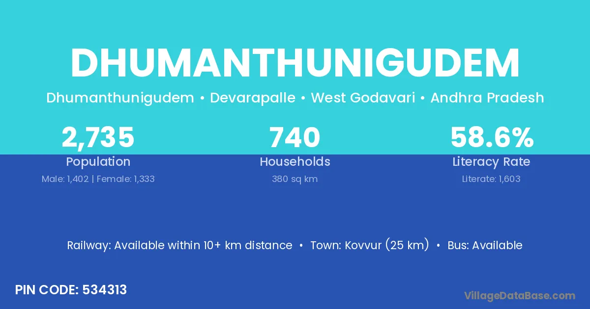 Kovvur (25 km) is the nearest town to Dhumanthunigudem village for major economic activities and is located approximately 25 km away.