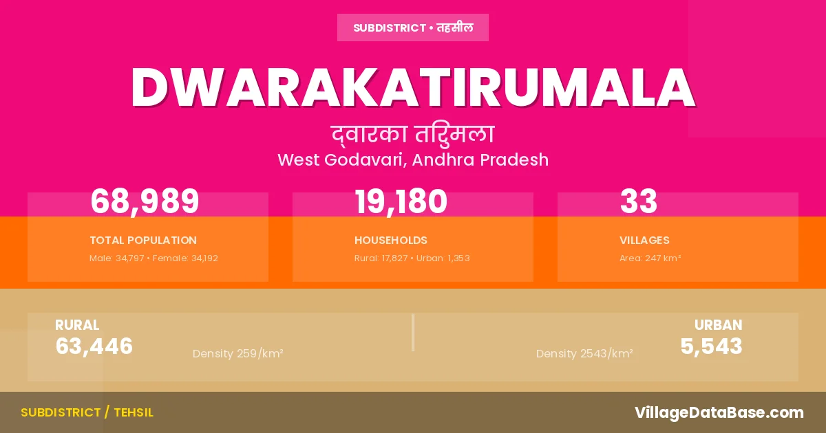 According to the 2011 census The total area of Dwarakatirumala Mandal is 247 km², with a population of 68989 people. The population density is 279 inhabitants per square kilometre, and there are approximately 19180 houses in the sub district.