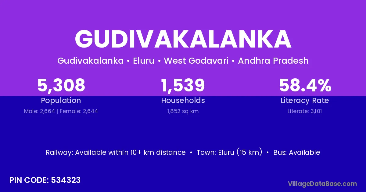Eluru (15 km) is the nearest town to Gudivakalanka village for major economic activities and is located approximately 15 km away.