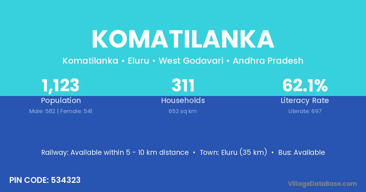Komatilanka village has a total population of 1,123 people, of which 582 are males and 541 are females.