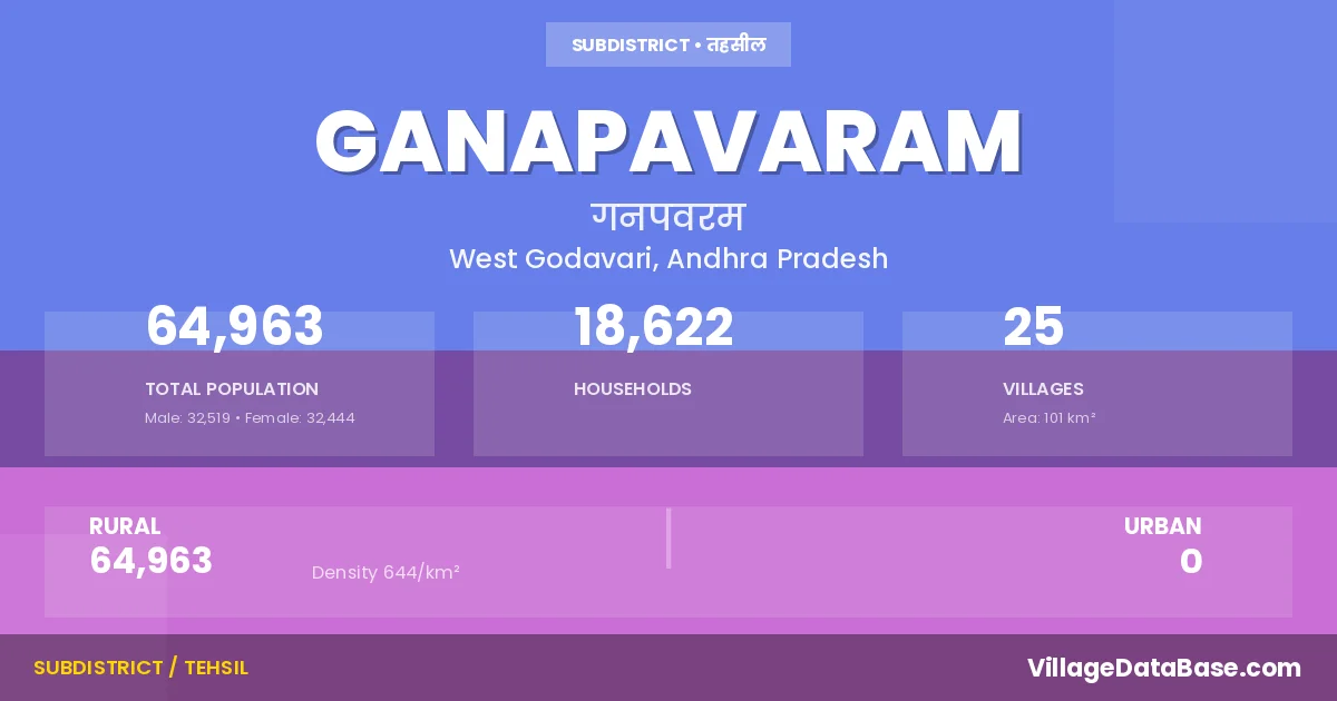 According to the 2011 census The total area of Ganapavaram Mandal is 101 km², with a population of 64963 people. The population density is 644 inhabitants per square kilometre, and there are approximately 18622 houses in the sub district.