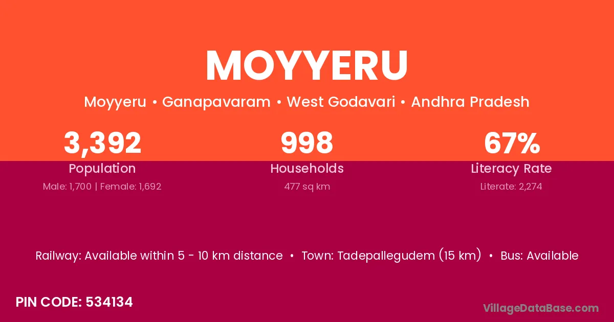 Tadepallegudem (15 km) is the nearest town to Moyyeru village for major economic activities and is located approximately 15 km away.